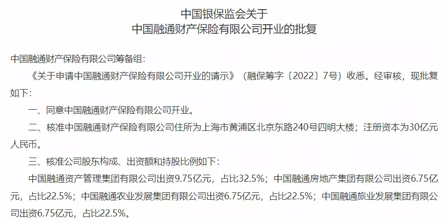 2021年4月正式获批筹建的中国融通财产保险有限公司(以下简称“融通财险”),于2022年1月29日正式获批开业。