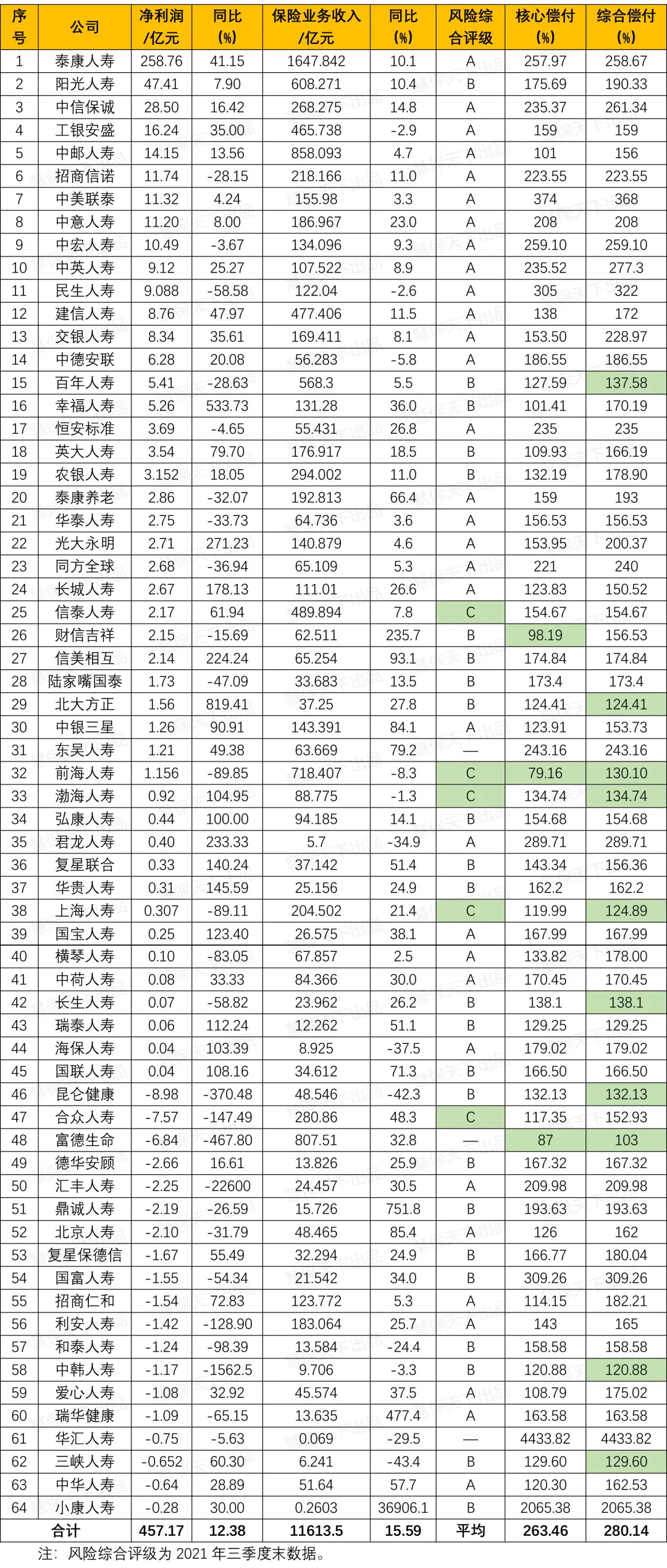 附表 2021年64家非上市寿险公司净利润、保险业务收入及偿付能力