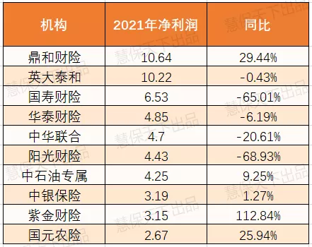 具体来看,在2021年排名前十的财险公司中,只有鼎和财险、中石油专属、中银保险、国元农业、紫金财险5家险企实现利润正增长,其中紫金财险正增长112.84%,而英大财险、国寿财险、华泰财险、中华联合财险、阳光财险均实现净利润负增长,其中阳光财险、国寿财险分别下滑68.93%、65.01%。