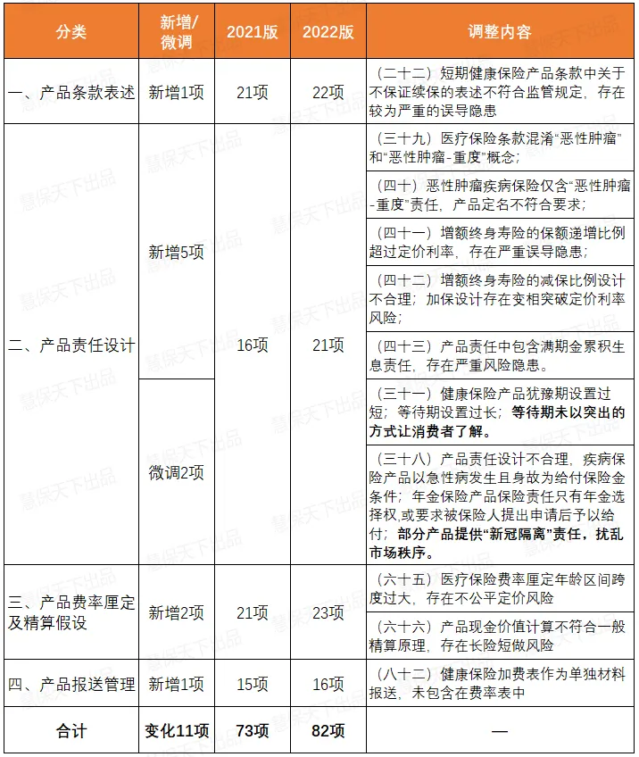 同时,银保监会也于2021年1月下发人身保险产品开发设计负面清单,73条内容覆盖产品条款、产品责任设计、产品费率厘定及精算假设、产品报送管理。