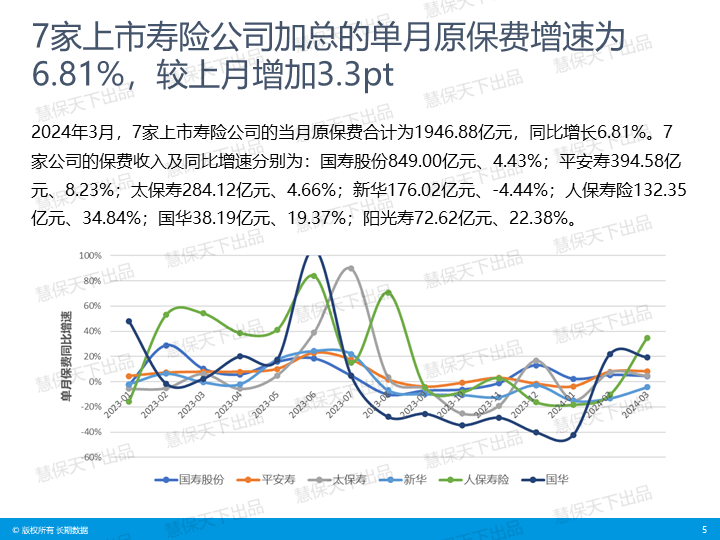 但就3月单月来看,7家寿险公司原保费收入合计1946.88亿元,同比增长6.81%,增速较前2月提升3.3个百分点,仅新华保险原保费收入同比下降4.44%,其余6家公司均实现正增长,其中,人保寿险增幅最高达34.84%,此外,阳光人寿和国华人寿的增幅分别高达22.38%和19.37%。具体而言: