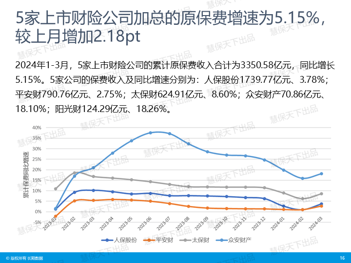 一季度,人保财险、平安产险、太保产险、阳光产险、众安在线5家上市财险公司的累计原保费收入为3350.58亿元,同比增长5.15%,增速较前2月增长2.18个百分点。上述公司保费收入均同比增长,其中,阳光产险和众安在线的增幅分别高达18.26%和18.1%。