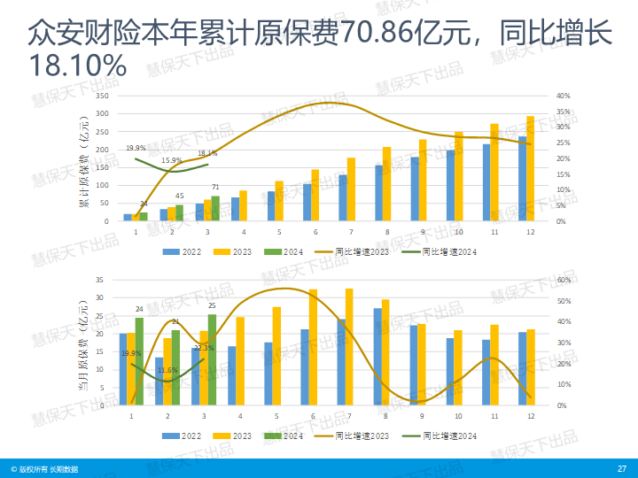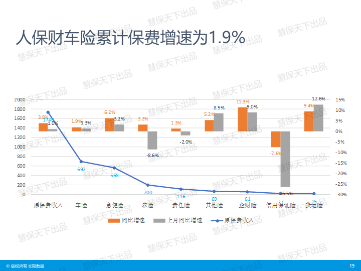 5家上市财险公司一季度原保费收入均实现同比增长,其中,阳光产险和众安在线的增幅分别高达18.26%、18.1%。进入3月,受乘用车销量回升以及政策性业务招标的推动,财险险企保费收入加速增长,众安在线、阳光产险、太保产险3家公司实现单月双位数增长。
