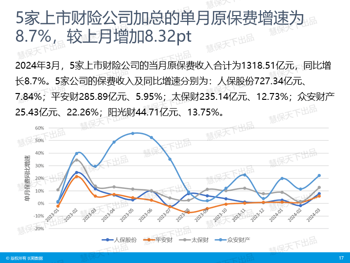 3月当月,5家财险公司原保费收入合计1318.51亿元,同比增长8.7%,其中,众安在线涨幅高达22.26%,阳光产险和太保产险均实现双位数增长。具体而言: