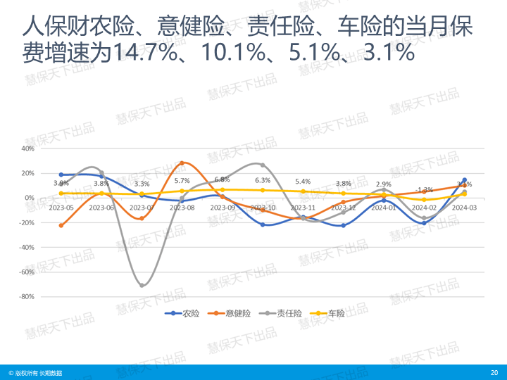 中汽协数据显示,3月国内乘用车销量181.2万辆,环比增长78.1%,同比增长5.8%,受益于节后消费复苏推动车险等业务回暖,财险险企3月保费收入增幅明显加速,相较2月增加8.32个百分点。此外,券商研报分析称,政策性业务招标启动推动意健险、农险3月单月同比增长10.1%和14.7%。