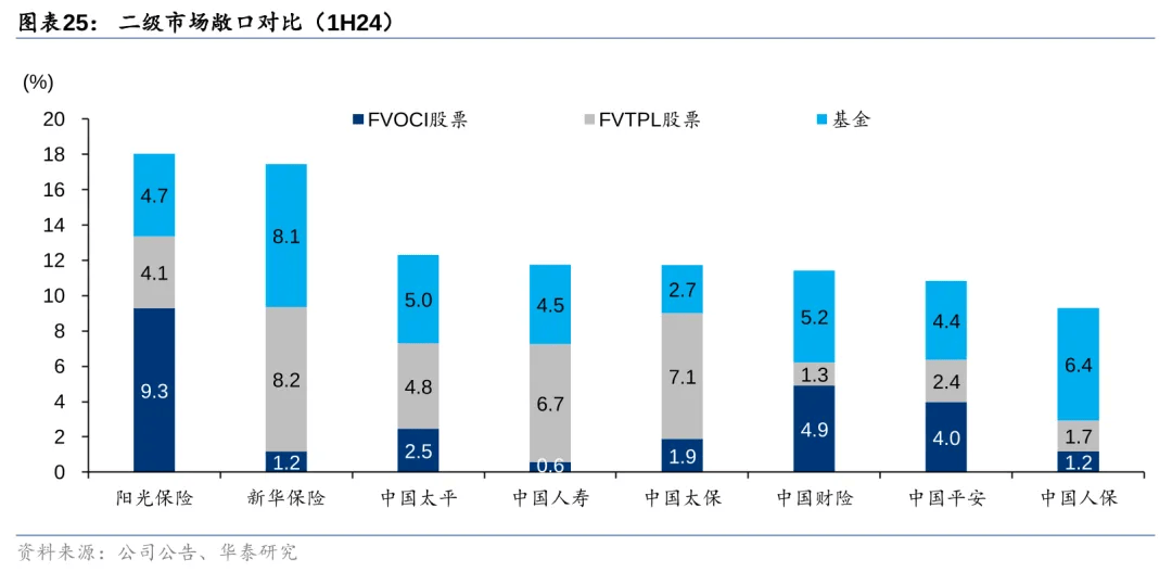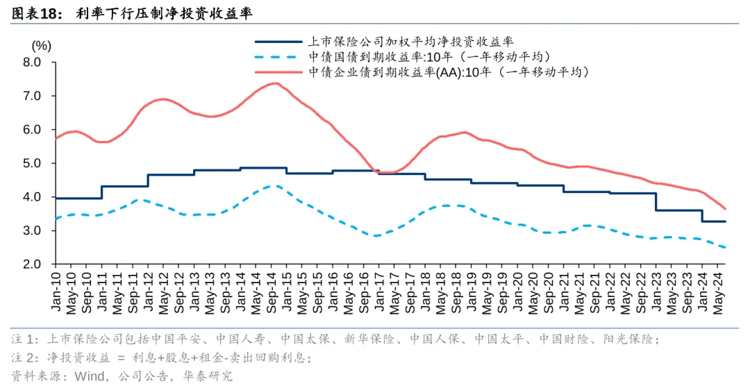 在过去的10多年中,上市公司的NIY基本处于无风险利率和AA信用债收益率之间。2013-2017年,上市保险公司平均NIY达到5.0%左右,属于相当高的水平。这一阶段10年期无风险利率最高触及4.5+%,为高投资收益率创造了良好的利率环境。2018年后,伴随着市场利率的不断走低,保险NIY也节节下行。2023年以来的利率快速下行对险资带来较大压力,平均NIY从2022年的4.1%下降至1H24的3.3%。需要指出的是上半年的NIY通常会被低估,因为大部分股息收入是下半年发生的。但利率下行的压力是显而易见的。