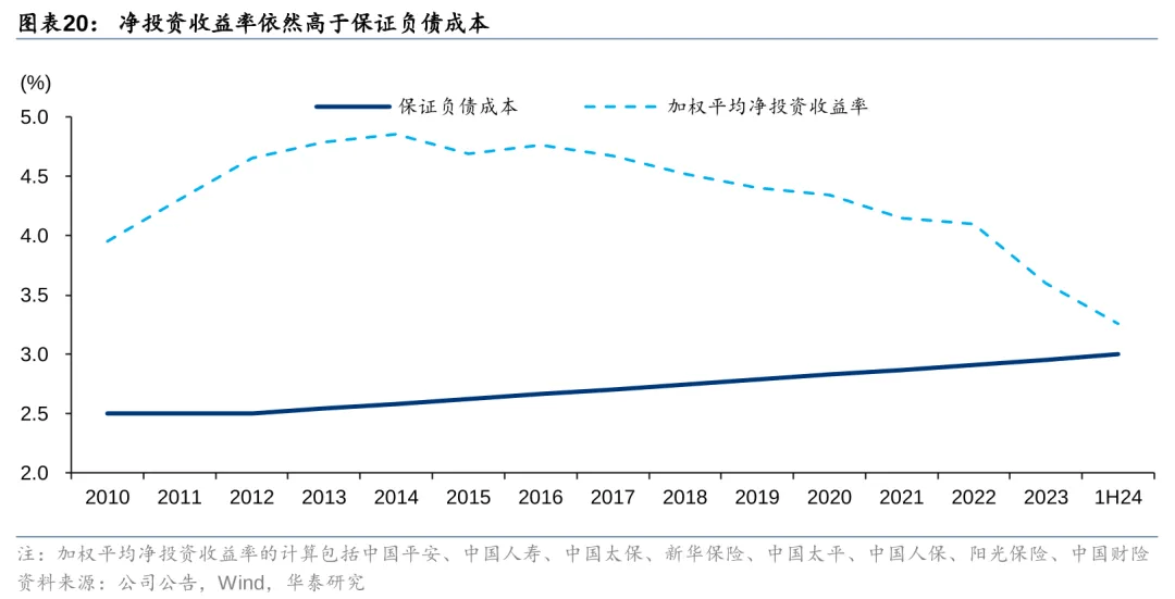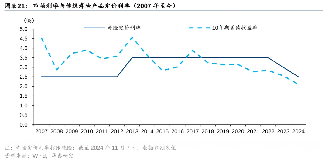 2013年是上一轮寿险定价利率改革的起点。2000到2013年,寿险业执行统一2.5%的保证利率(定价利率)水平,刚性负债成本较低。这一阶段以分红险为主,所以整体资金成本要远高于2.5%。