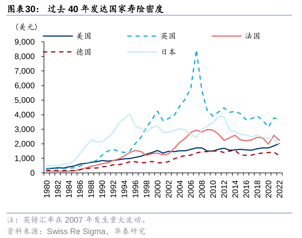 除了美国以外,1980年海外其他发达经济体如日本、英国、德国、法国的人均GDP在2万美元上下,寿险深度在0.9%-4.6%之间。在利率下行周期中,保费也都呈现出快速增长的趋势,法国/英国/德国/日本的保费规模增长至21/13/8/5倍,年化增速达到7.9/6.7/5.3/4.3%,寿险密度提升至18/11/7/5倍。