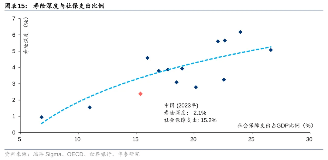 中国2023年的社会保障支出占GDP比重为15.2%,寿险深度为2.1%。我们认为随着中国经济发展,社会保障支出和商业保险支出都将持续增加。中国目前的位置,处于社保相对较强而商业保险相对较弱的状态(位于拟合线的下方)。在保障这件事上,公共部门的投入力度大,私人部门投入的力度相对不足,预示着中国商业寿险需要加快发展,以提升全方位的保障水平。