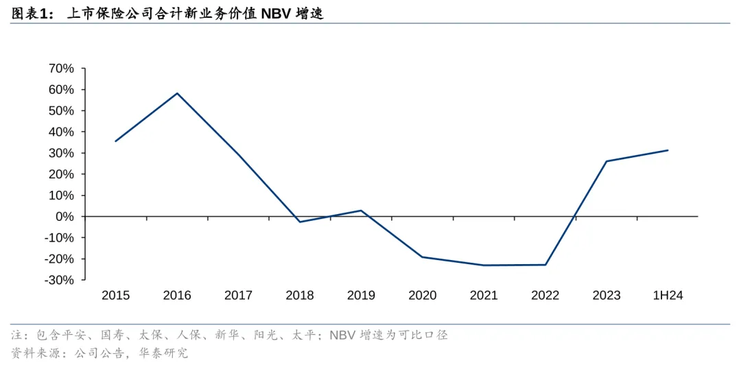 产品利润率的大幅提高,进一步推动了NBV的增长。2023年7家上市保险公司合计NBV增速约为26%(可比口径,下同),增长受新单保费提升和利润率提升的双重驱动。1H24虽然新单出现负增长,但NBV利润率的大幅提升支撑了NBV实现更强劲的增长,1H24合计NBV增速达到31%的出色水平。