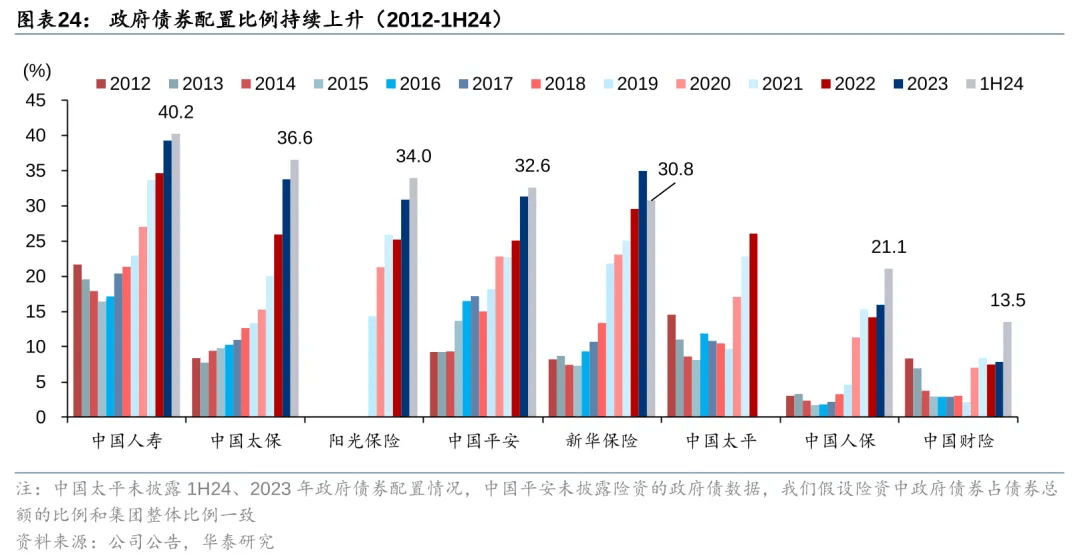 保险资金的债券投资(不含永续债优先股比例过去几年稳中有升,并在2023年加速上升,挤出了非标投资的比例,显示保险资金整体风险偏好在下降。其中,政府债券的配置比例在过去几年迅速上升,寿险公司尤其明显。我们估计,6家主要上市保险公司2023年和1H24分别增配了1.29/0.67万亿的政府债,占当年保险资金新增规模的85%/50%。