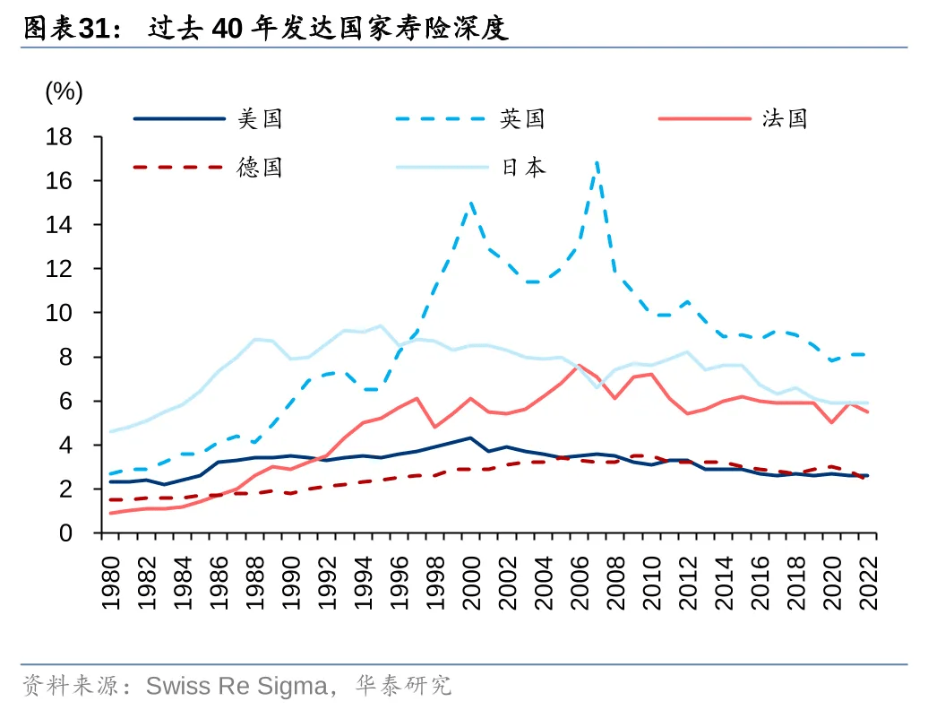 在这40年(1980-2020年)的利率下行周期中,海外发达国家的保险行业规模仍在持续提升,显示保险产品在利率下行周期中对投资者的吸引力。以美国为例,美国在1980年的人均GDP 31,082美元,寿险深度(寿险保费/GDP)为2.3%(这里仅包含人寿保险保费,不含健康险保费,因此有所低估)。在随后的四十年利率下行期,寿险业持续增长,到2020年寿险业保费增长至1980年的9倍,年化增长率达到6%。
