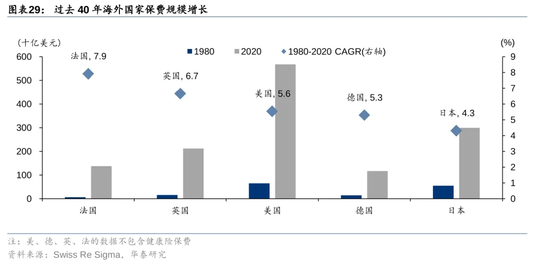 以美国为例,寿险业保费四十年中增长至9倍(1980-2020),年化增长率达到6%;日本在这期间寿险业保费增长至5倍(1980-2020),年化增长率达到4%。对中国的启示就是,利率下行对保险业的增长可能更多是动力而非阻力。