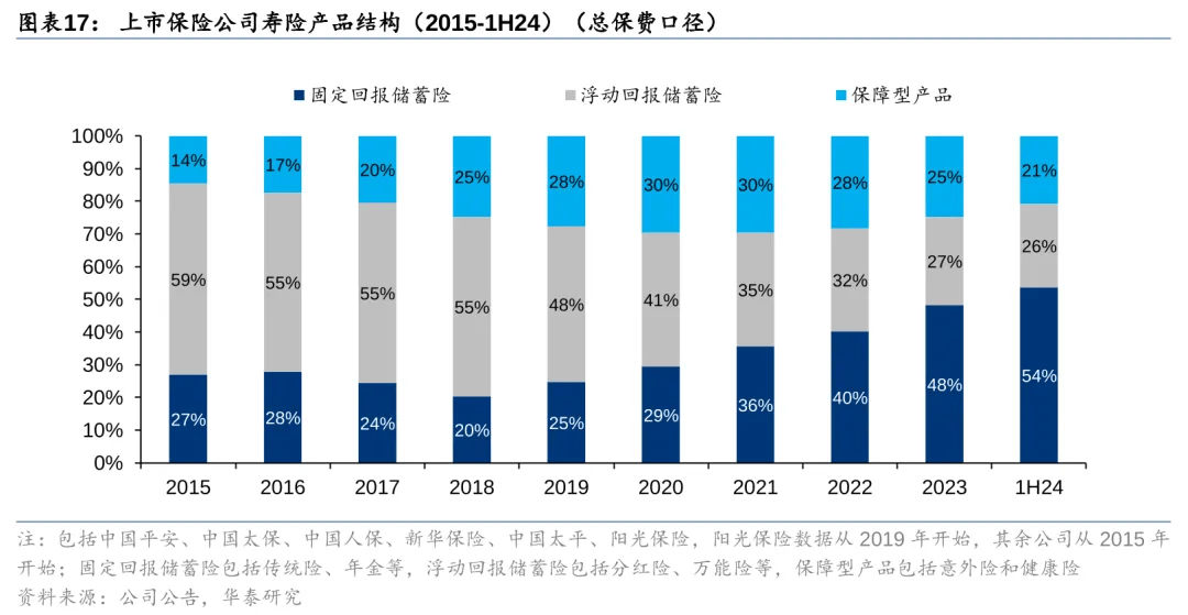 上一轮2013/2015年定价利率改革之后,浮动型产品占比持续下降。我国上市保险公司浮动型储蓄险产品包括分红险和万能险,合计保费占比呈现下降趋势,由2015年的59%下降到1H24的26%。具体来看,浮动型产品主要以分红险为主,1H24分红险占浮动险比例达61%,2015年以来分红险、万能险占比均有所下降。注意这里是总保费口径,其中包含续期保费,会延缓保费结构的变化。如果从新单保费的角度看,变化会更剧烈。