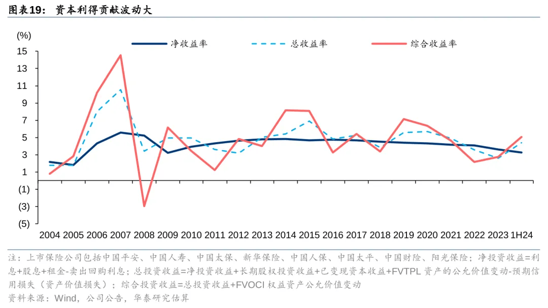 净投资收益加上计入利润表的资本利得,包括金融资产公允价值波动和联营企业收益构成了总投资收益(TIY),影响会计净利润,也被称为财务口径的投资收益;总投资收益加上计入其他综合收益(OCI)的资本利得构成了综合投资收益(CIY),影响净资产,是衡量险资投资表现的最全面指标。总/综合投资收益率围绕净投资收益率波动,且综合投资收益率的波动比总投资收益率更大。过去二十多年(2004-1H24)的数据显示,上市公司平均综合投资收益率也仅仅较净投资收益率年均增厚68bps,如果以12-15%的权益资产投资比例估算,资本利得(主要为股票资本利得)年化复合收益率大约为5%,相比于大盘(沪深300)这一期间的表现并不是特别高。