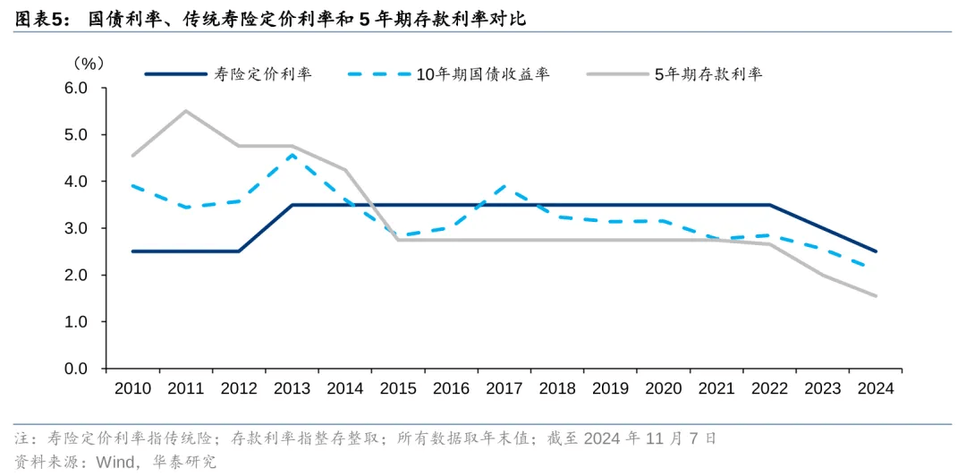 同时, 储蓄险的收益要高于存款。从历史上看,2015年以来,传统险定价利率比5年期存款利率高75-100bps。截至2024年10月末,寿险传统险定价利率为2.5%,比5年期存款利率(1.55%)高95bps,高收益、长期限特征明显。可以说,储蓄类寿险产品是兼具长期和安全特征的零售金融产品。