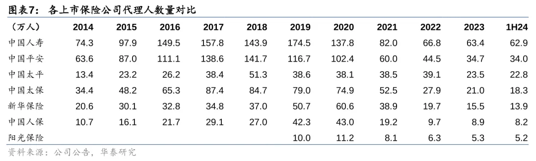 代理人改革有望推动产能持续增长。代理人渠道依然是上市寿险公司最重要的价值创造渠道,1H24NBV占比合计约为80%,代理人渠道的转型升级将有望持续推动代理人效率提升以及寿险公司的NBV增长。