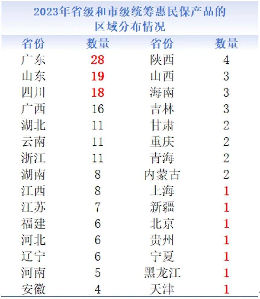 值得注意的是, 其中推出产品数量最多的省份,是惠民保的诞生地广东省,一共有28款产品。山东、四川、广西地区的惠民保产品数量均超过了15款,基本实现了全省地市级产品的全覆盖。
