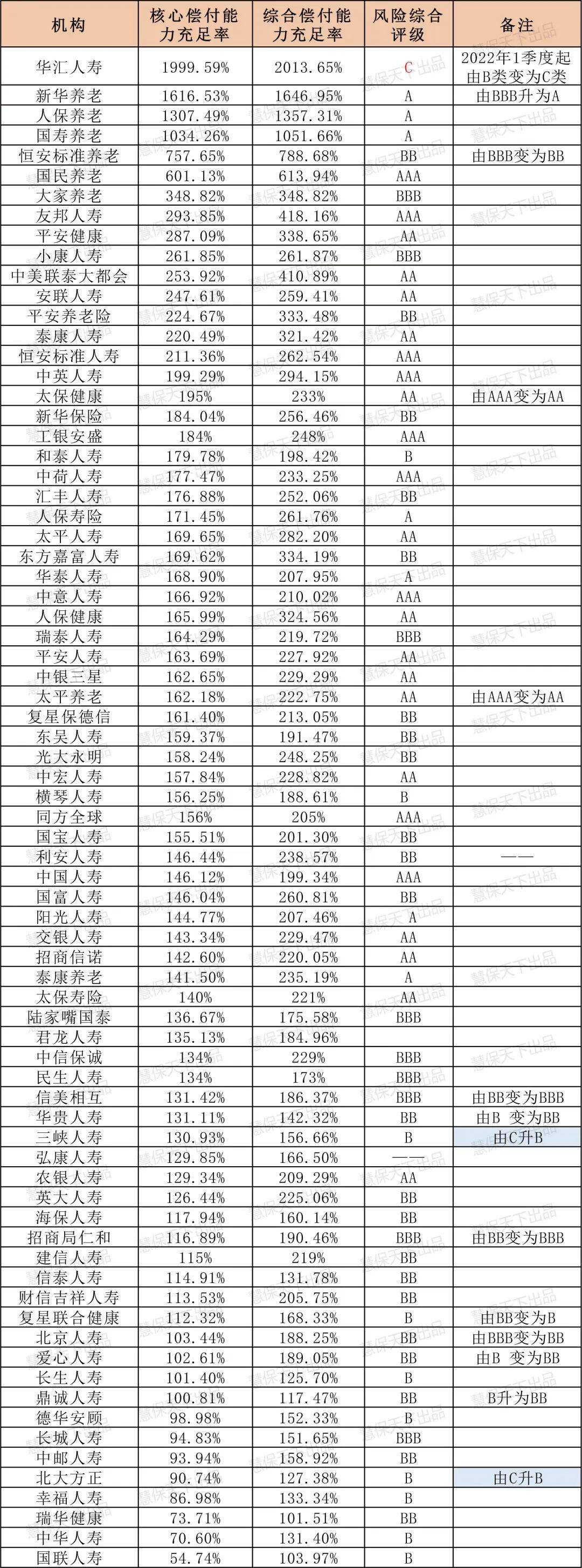 整体来看,虽然所有公司在偿付能力的数值都满足监管要求(核心偿付能力充足率不低于50%、综合偿付能力充足率不低于100%),但在量化指标之外,风险综合评级这一定性指标也需要关注,一季度报告中,仅华汇人寿一家公司仍为C类,此前同为C类的三峡人寿、北大方正人寿,也都已经由C升为B类。
