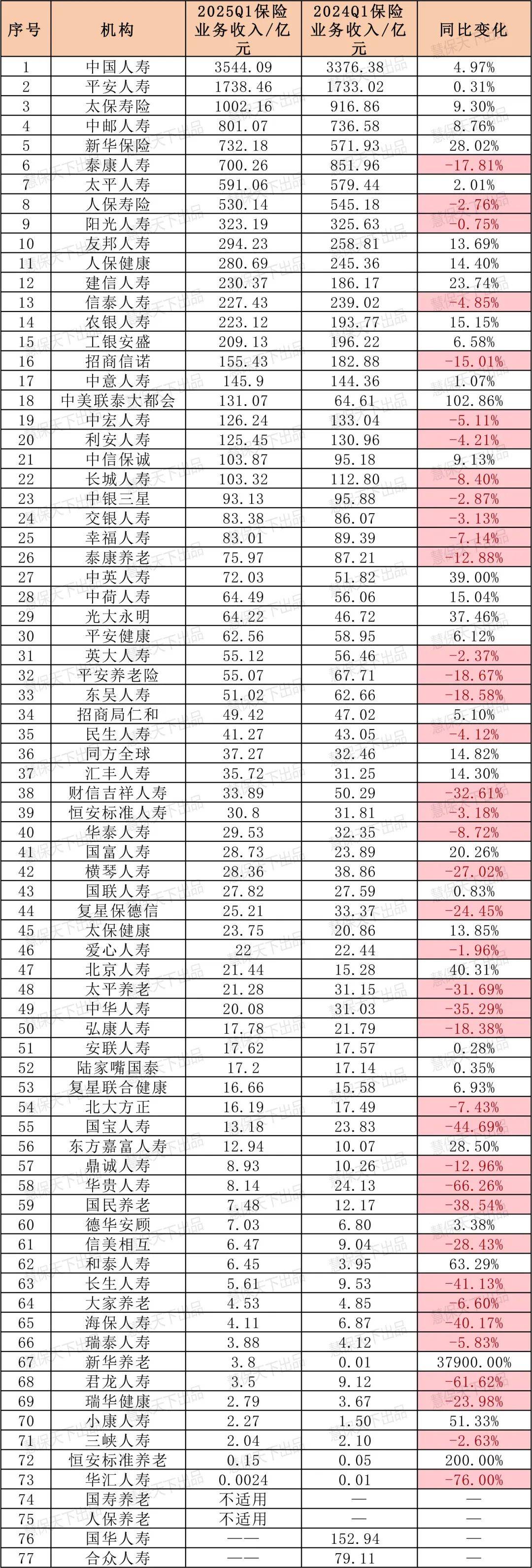 整体来看,73家有可比数据的人身险公司合计实现保险业务收入13744.18亿元,同比增长3.16%。