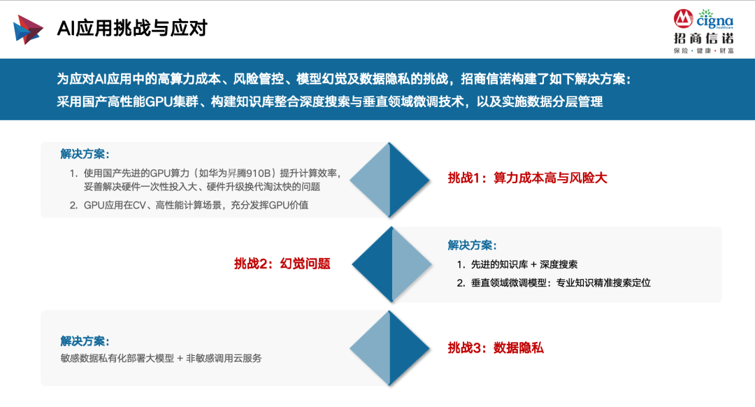 2023-2024年,招商信诺做了很多尝试。2025年春节前后,DeepSeek的出现是一个重大事件。2024年我们意识到CPU和老显卡技术已经无法适应现代技术发展,开始考虑新算力的选择。当时英伟达很火,但鉴于国际形势,我们担心其“护城河”会对我们的投入和技术发展产生影响。于是我们选择了国产昇腾系列,在生产环境应用上慎之又慎。现在看来,这个选择是正确的。2025年春节后,DeepSeek开放权重,让我们IT人员非常鼓舞。之前我们面临有硬件但大模型成本高、性价比低、稳定性差等问题,但DeepSeek出现后,应用模式快速转变,行业内技术每月都在变化,我们的应用也发生了巨大变化。