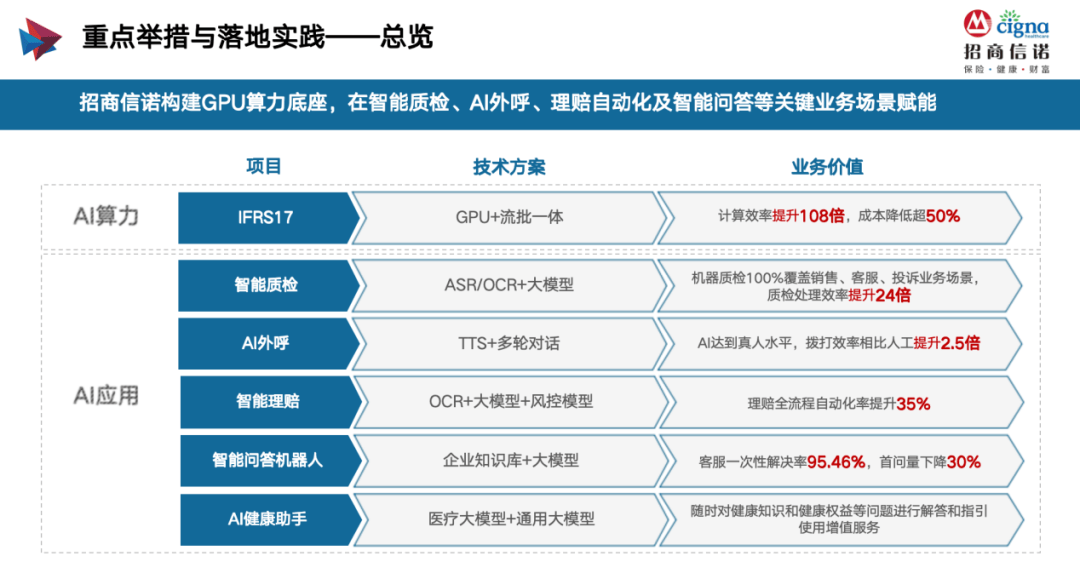 张琦介绍了近年来招商信诺聚焦高价值场景,坚持渐进融合策略,在多个领域开展的实践:在IFRS17项目上,该公司采用国产GPU和昇腾底层框架进行高性能计算,成为国内IFRS17计算中使用GPU的先行者,实现计算效率百倍提升,成本大幅下降;智能质检领域,成功替代9成人力,显著提升效率;云外呼技术成熟,正探索更合适应用场景;智能理赔借助图像识别技术突破,实现每天处理250万张图片;此外,在智能风控、知识库建设及医疗垂直模型开发等方面也成果显著。