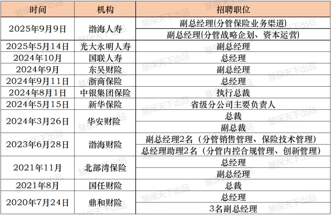 一则,渤海人寿公开招聘2名副总经理,而据慧保天下不完全统计,近几年,已有不少于10家的保险公司通过公开招聘的方式,向全社会选聘总经理、副总经理等关键岗位。