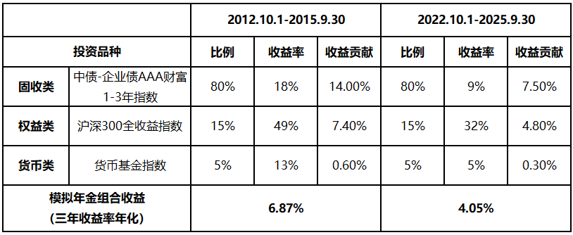 平安养老险构建了以中债-企业债AAA财富1-3年指数(CBA0421.CS)、沪深300全收益指数(H00300.CSI)、货币基金(H11025.CSI)为成分的模拟年金组合。同时依据行业经验,对上述三类品种分别赋予80%、15%、5%的权重,测算得出:该模拟组合10年前的三年年化收益率(即2012年10月1日至2015年9月30日)为6.87%。