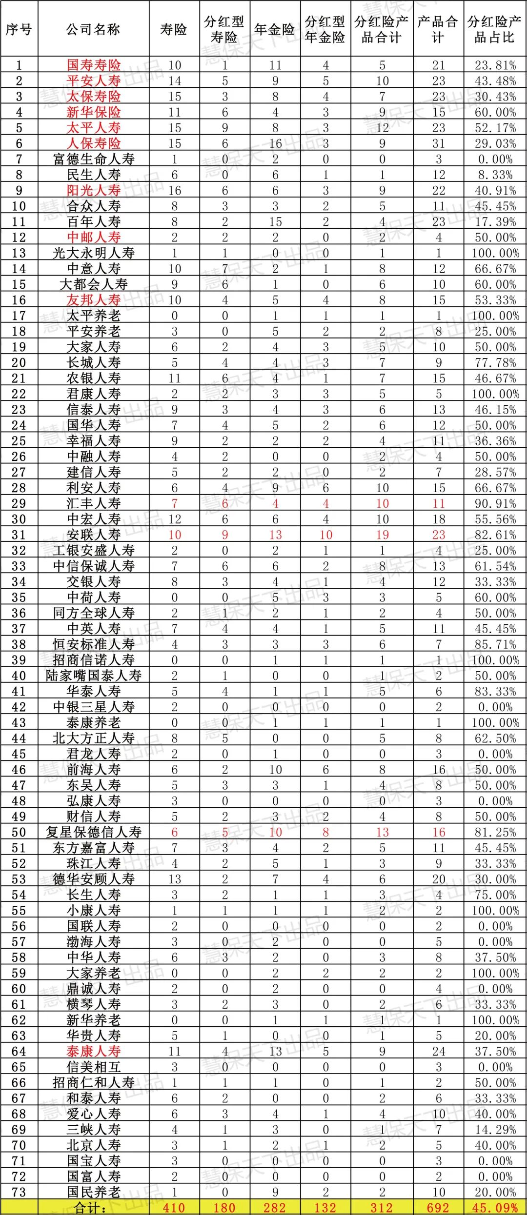 凭借着投资能力与渠道优势,头部机构对于分红险的持续加码,已有了初步效果。统计显示,预定利率切换后,太平人寿、平安人寿、新华保险、泰康人寿等10家头部机构已合计上新80款分红险产品,占行业已上新分红险产品数量的25.64%。头部机构对于产品上新的侧重方向也有差异,比如国寿寿险侧重于推出分红型年金,与万能险账户相组合;太平人寿更侧重于寿险板块,推出了包括“太平智悦人生B款终身寿险(分红型)”“太平岁优保两全保险(分红型)”在内的9款分红型寿险产品。