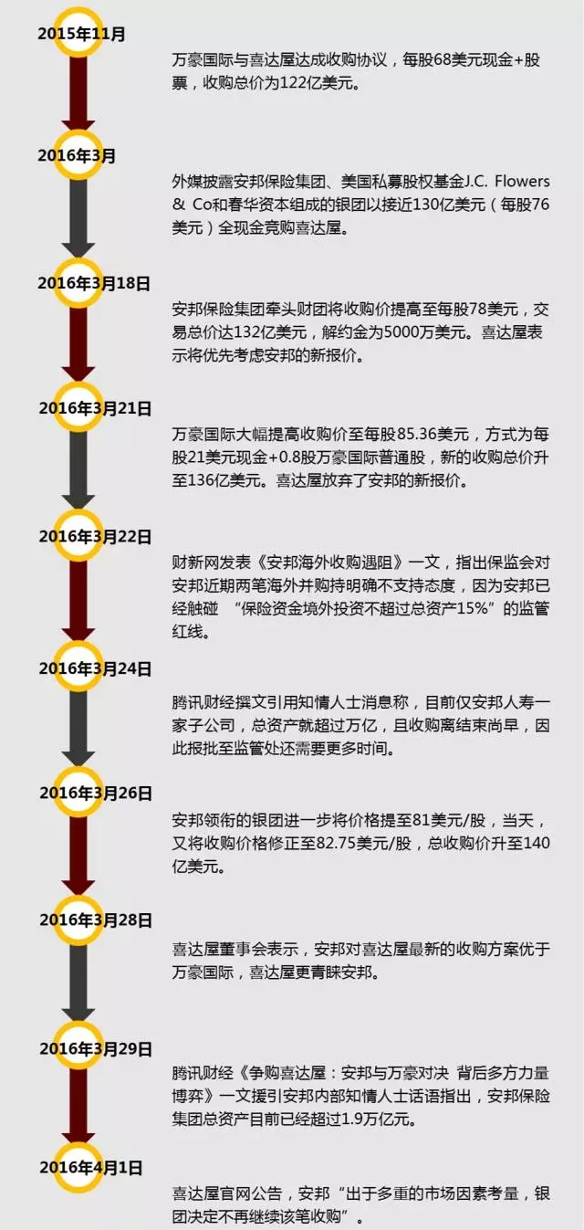 3月开始,安邦保险集团、美国私募股权基金J.C. Flowers & Co和春华资本组成的银团开始介入到万豪国际对喜达屋的收购中,提议以接近130亿美元全现金收购喜达屋。出手阔绰且全部为现金的安邦保险集团很快获得了喜达屋的好感,但由于万豪国际大幅提高收购价格,安邦不得不三次加价,将交易价格大幅提升至140亿美元。然而就在喜达屋明确表示更青睐安邦领衔的银团之后,市场都在等待万豪会否进一步追加之时,安邦却突然收回了收购要约。