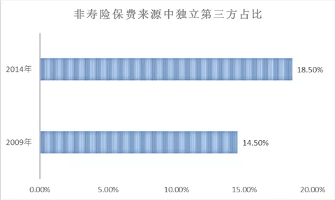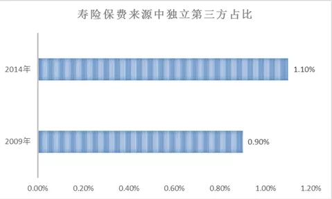 先看来自中金研究报告的几个数字。我国寿险业保费来源,独立第三方占比从2009年的0.9%增长到2014年的1.1%;非寿险保费来源,独立第三方占比从2009年的14.5%增长到2014年的18.5%。5年市场占有率分别增长了0.2%和4%,5年累计增幅也仅为22%和27.6%。在保险业保费膨胀的大背景下,可以看出,作为独立第三方的保险中介增长有限,并不是一个性感的生意。