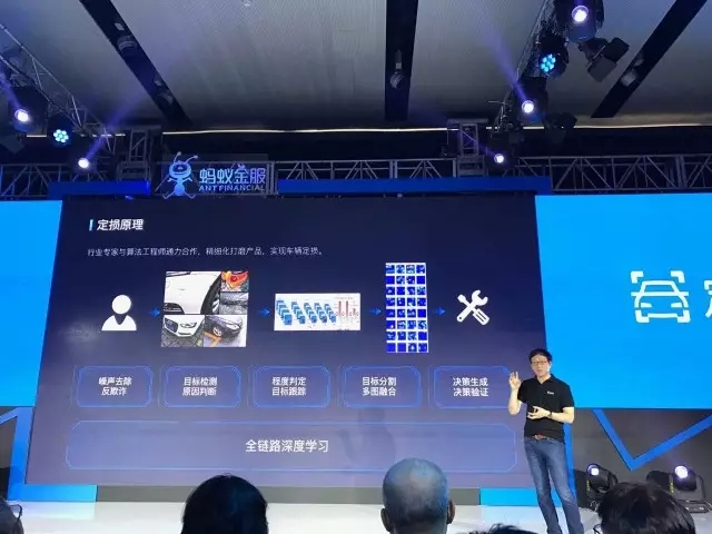 蚂蚁金服官方回答:“定损宝”应用了深度学习图像识别检测技术,用AI(人工智能)充当眼睛和大脑的作用,代替定损员的技能与工作。