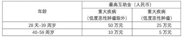 另外,与“相互宝”相同,该产品也是对不同年龄段的人进行了简单区分,28天-39周岁的人,最高互助金额为50万元,但是40-59周岁的人,最高互助金额只有10万元。