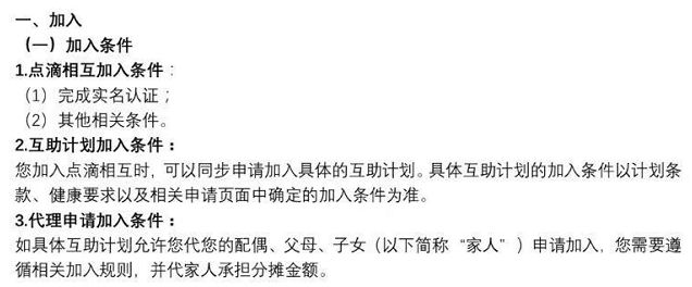 在会员加入条件上,点滴相互成员规则中并未详细列明,但是从目前披露的信息来看,应该是年龄在28天-59周岁之间的人,只要满足互助计划的健康要求,即可加入。同时,会员还可以代配偶、父母、子女申请加入。