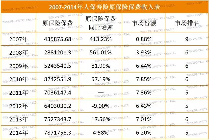 从2011年开始,行业开始使用新的会计准则,同时在诸多因素影响之下进入调整期,人保寿险保费增速随之下降,市场份额也有一定下滑,但原保险保费排名始终保持在5名或6名的位置。