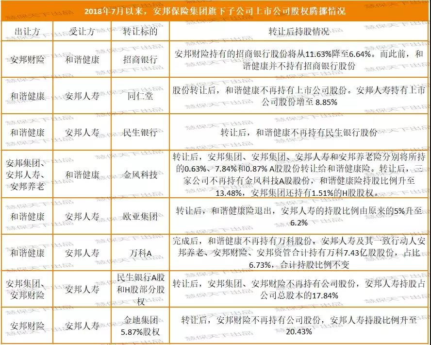 自2018年7月开始,安邦集团旗下子公司频繁腾挪股权,其中和谐健康更是将大量所持上市公司股权转给安邦人寿,截至2018年底,和谐健康只还持有招商银行、金风科技以及金融街三家上市公司部分股权。
