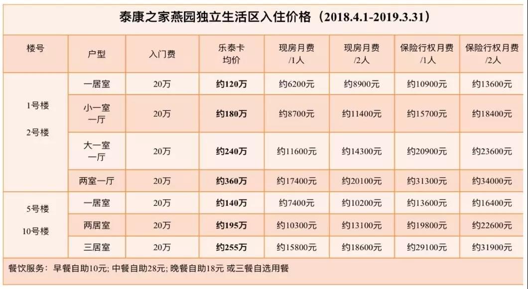 由于成本较高,泰康养老社区的收费标准也较高,以泰康北京燕园示例,自理区收取入门费和乐泰卡,均为押金性质,最小的一居室140万起,每月服务费约6200元/人,8900元/2人。护理区收取入门费20万元,每月服务费(含护理费)根据护理等级从1.6-2.4万元不等。