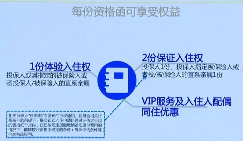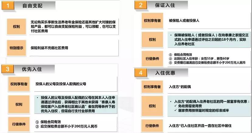 养老社区入住确认函则向客户承诺入住的相关权益,如投、被保人可享有保证入住权,投、被保人的父母可享有优先入住权等四大权益。