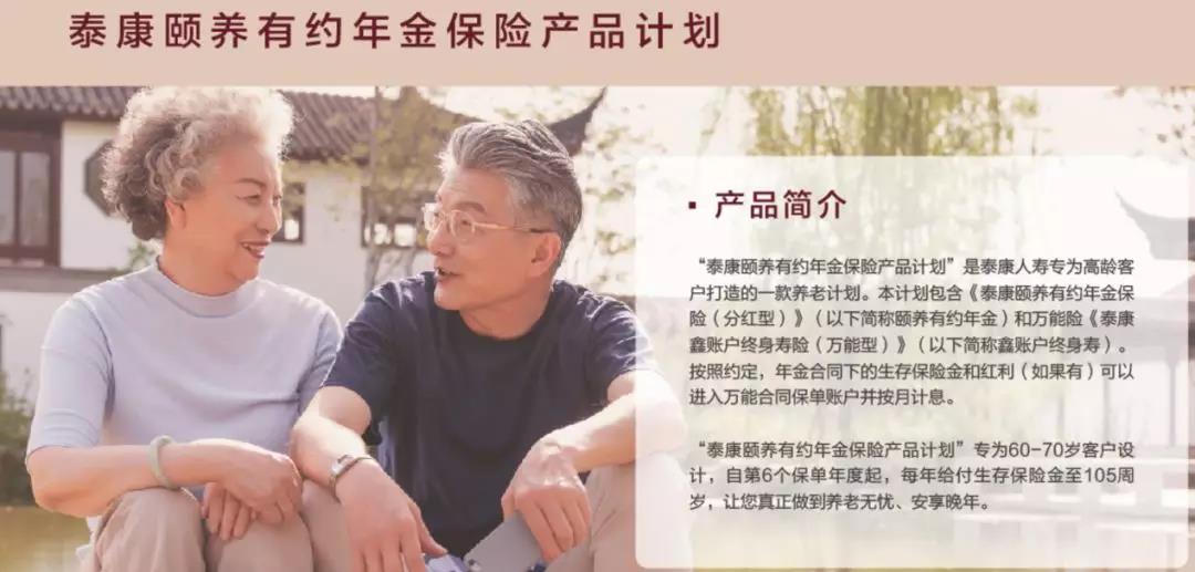 以泰康对接养老社区年金保险产品计划示例:其由一款年金保险(分红型)和一款终身寿险(万能型)组合而成,年金合同的生存保险金和红利进入万能合同账户按月计息。80岁入住养老社区时从万能账户中领取资金支付养老社区所需费用。