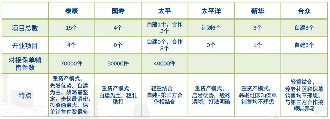 除上述4大险企外,新华人寿、合众人寿在养老产业上也布局多年,但无论是养老社区运营还是保单销售均不理想,与泰康、国寿、太平有较大差距。