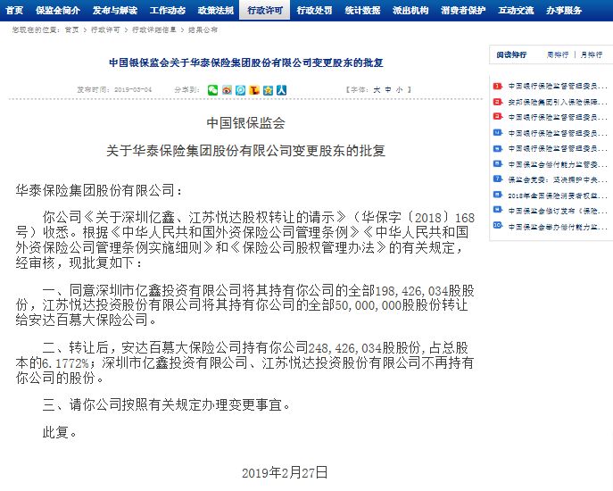 3月4日,中国银保监会发文批准华泰保险集团公司变更股东,安达百慕大保险公司受让华泰保险集团2.48亿股股份,占总股本6.1772%,加之此前其通过3家子公司持有的华泰保险集团20%的股权,安达系对华泰保险集团的持股比例合计达到26.1772%,并拥有了一票否决权,实现了对于华泰保险集团的控股。由此,华泰保险集团性质由中资变为合资,更成为国内首家外资保险集团/控股公司。