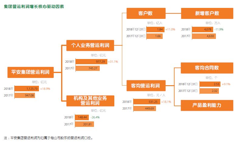 先看一组数据:2018年,中国平安个人业务营运利润达977.29亿元,同比增长31.1%,占集团归属于母公司股东的营运利润的86.8%,占比同比猛增8.1个百分点,主要得益于个人客户数和客均营运利润的稳定增长。