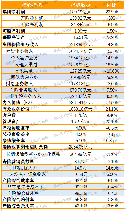 数据显示,2018年,中国太保集团实现营业收入3543.63亿元,其中保险业务收入3218.95亿元,同比增长14.3%;集团净利润为180.19亿元,同比增长22.9%;与此同时,集团内含价值达到3361.41亿元,较上年末增长17.5%。(2018年中国太保业绩数据详见文末表格)