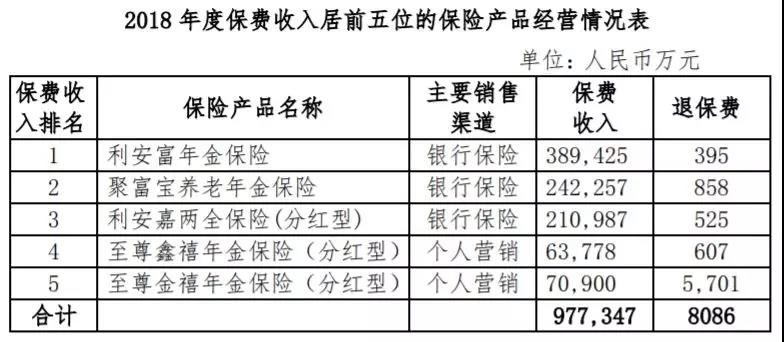 年报显示,利安人寿2018年规模保费116.40亿元,比上年增加了35.7%,其中寿险110.87亿元、意外险1.54亿元、健康险保3.99亿元。从产品收入情况看,保费收入排名前五的产品收入情况如下: