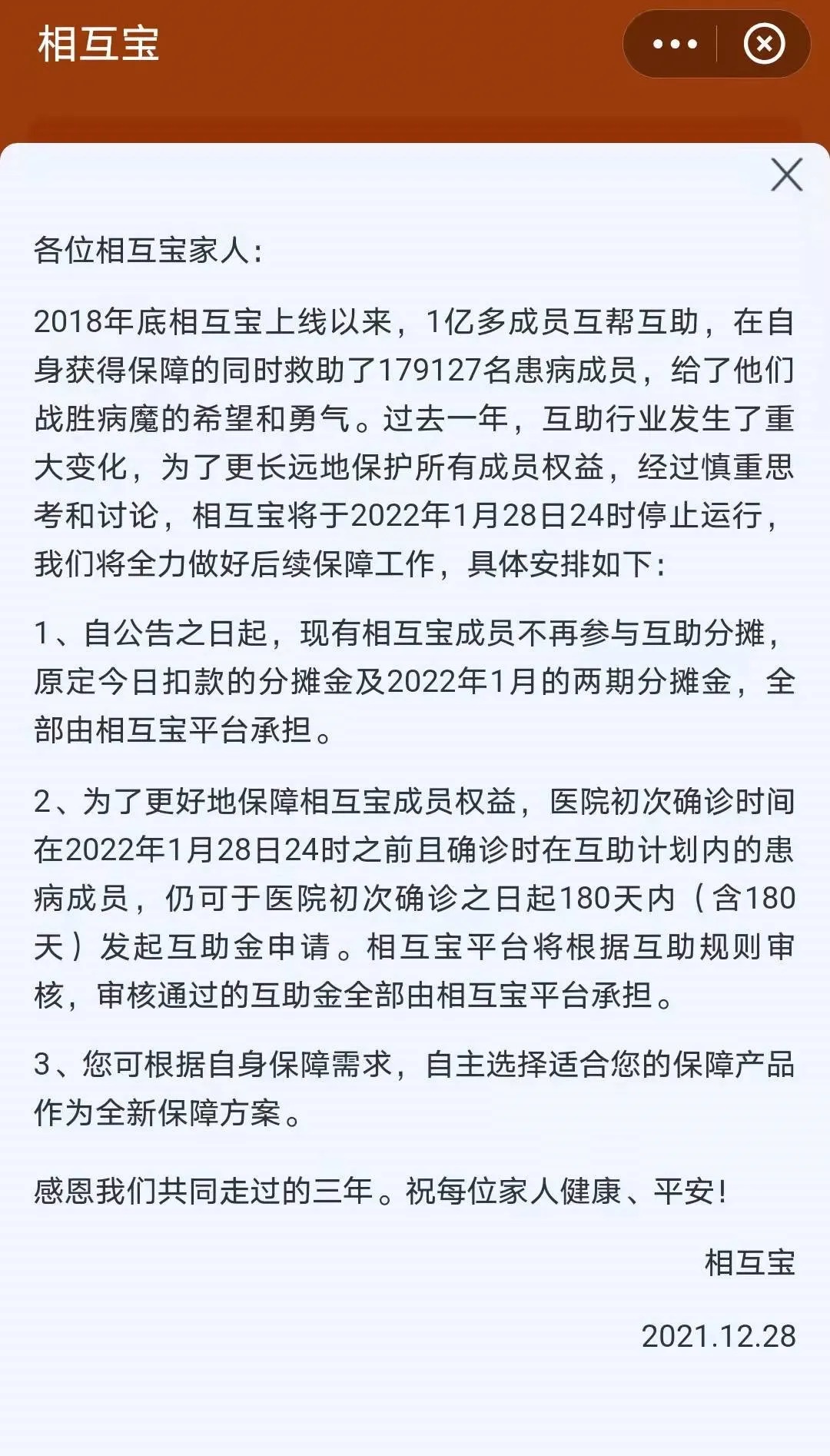 但是“过去一年,互助行业发生了重大变化,为了更长远地保护所有成员权益,经过慎重思考和讨论,相互宝将于2022年1月28日24时停止运行。我们将全力做好后续保障工作,”