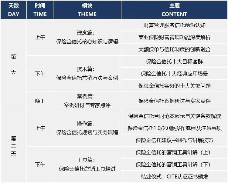 “认证保险金信托专家”CITE认证课程的研发和推出,力邀了多位来自头部信托、知名律所与专业财富管理等机构的领域专家,研究萃取了国际国内大量家族信托和保险金信托的典型案例经验,梳理了监管对于财富管理服务信托的各项法规和政策。课程设有保险金信托“理念篇”“技术篇”“操作篇”和“工具篇”四大模块,是为财富管理从业者量身打造的集品牌认证、能力建设、资源整合、精英社交于一体的职业提升培训。