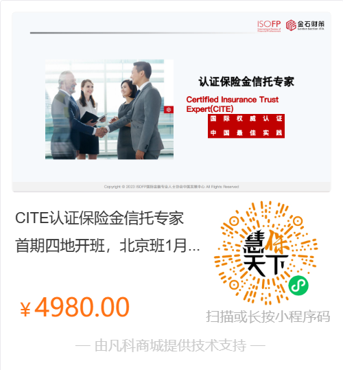 为助力中国保险金信托服务能力和专业水平的全面提升,金石财策与ISOFP国际金融专业人士协会中国发展中心,联合推出“认证保险金信托专家”——CITE(Certified Insruance Trust Expert)。
