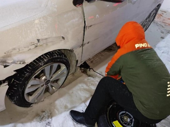 12月14日,辽宁朝阳一位车主在驶离高速时,车辆碰撞护栏,造成轮胎爆裂。平安产险辽宁分公司理赔员于浩查勘现场后化身“修车小哥”,蹲在雪地里协助客户快速更换备胎。