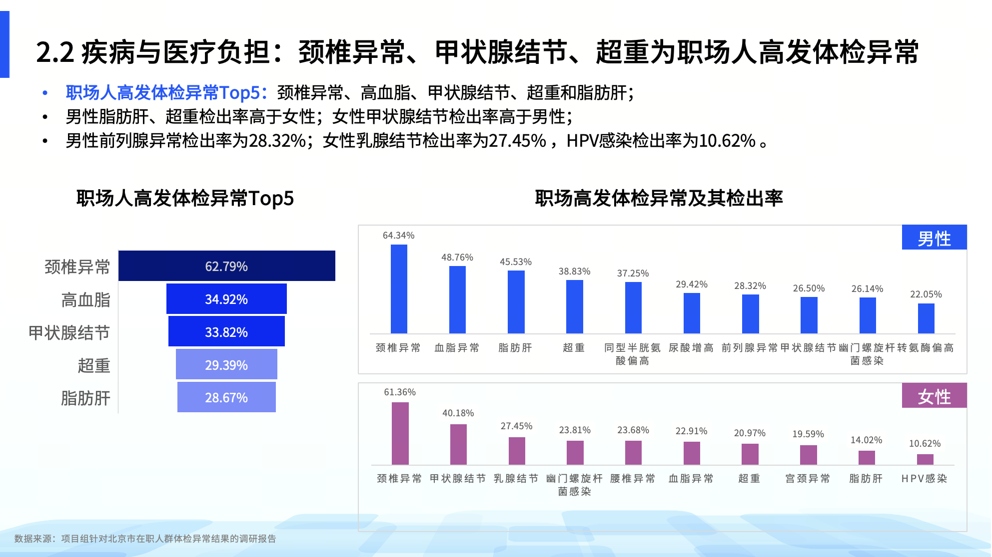《报告》显示,职场人高发体检异常Top5为颈椎异常、高血脂、甲状腺结节、超重和脂肪肝,占比分别为62.79%、34.92%、33.82%、29.39%和28.67%。这意味着,约2个职场人中就有1人颈椎异常,3人中即有1人检出甲状腺结节。同时,近四成职场男性有超重风险,女性结节检出率近七成,包括甲状腺结节和乳腺结节。