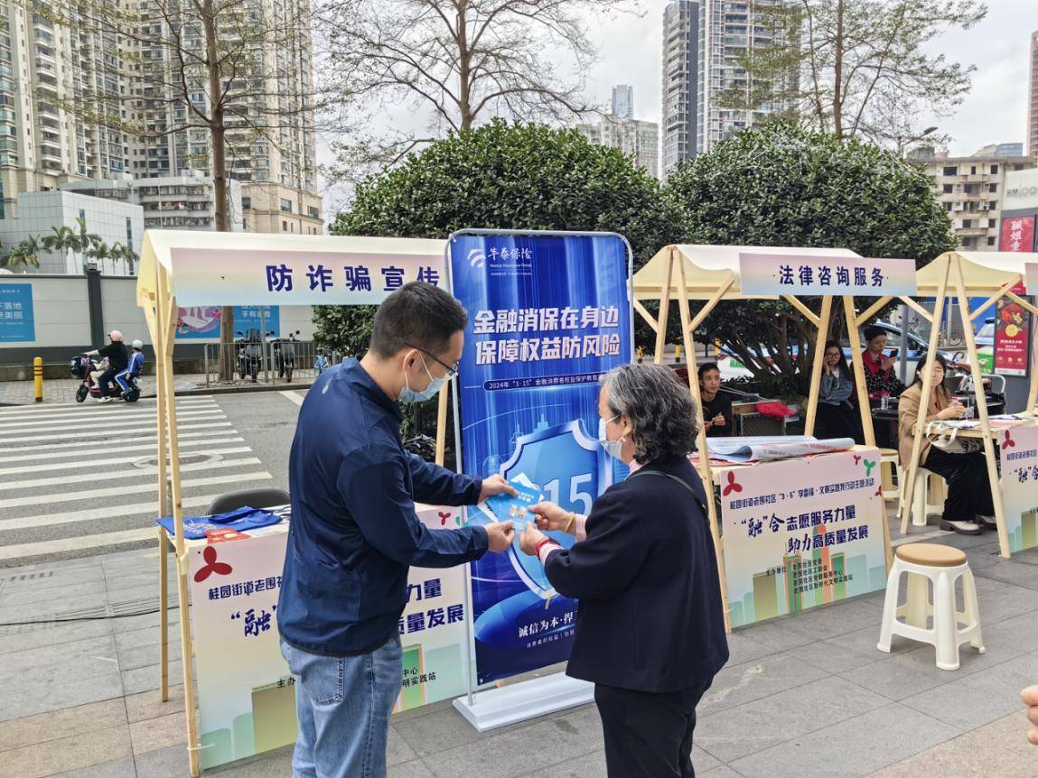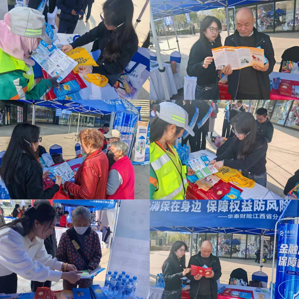 (六)华泰财险江西省分公司积极参与由国家监督管理总局江西监管局主办,江西省保险行业协会承办的江西保险业2024年“3·15”金融消费者权益保护教育集中宣传活动。组建宣传小队,前往人流量密集的广场进行宣传活动,通过现场设置展台、发放宣传折页、消保知识问答互动等方式,普及金融知识,提升社会公众金融风险防范意识,提高广大群众的自我维权意识和法律意识,主动远离各类违法违规金融活动。